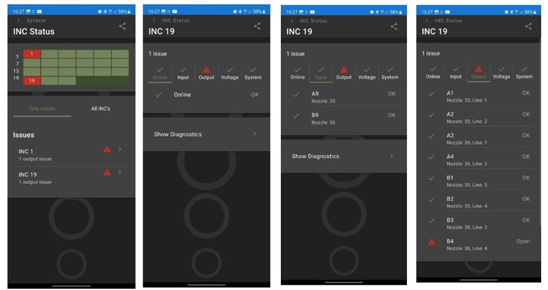 Lykketronic developed diagnostic app provides the Technician with a mobile user interface whilst diagnosing issues on the machine. Menu access can be configured to provide certain features to the end user, such as nozzle test and export diagnostics data.