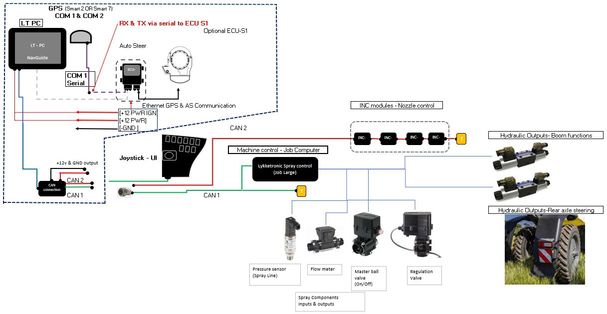 Lykketronic Liquid control solutions can offer very simple automatic rate control with minimal ECU inputs through to complete ECUs for handling liquid regulation, section control, regulation valve positions and pressure & flow inputs. Hardware for this solution can also be extended to handle hydraulic inputs & outputs for features such as boom folding or spray pump PTO outputs.