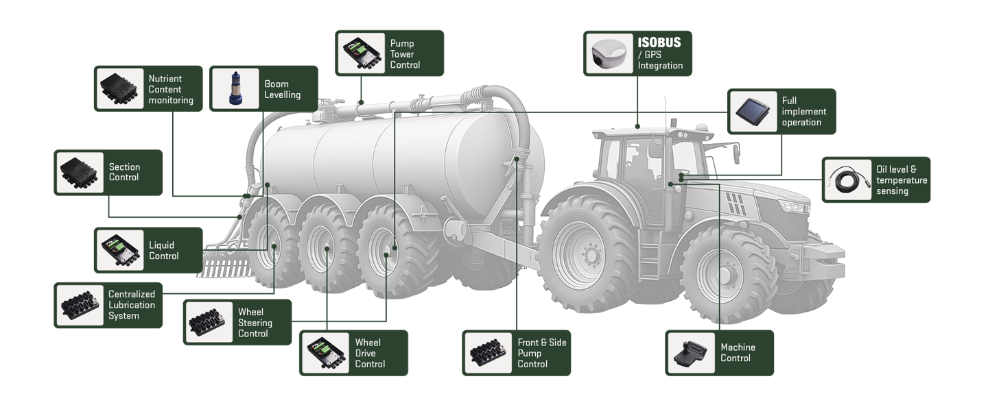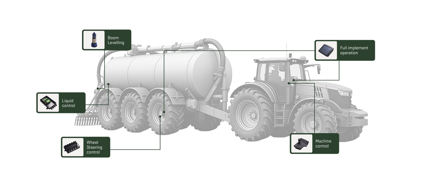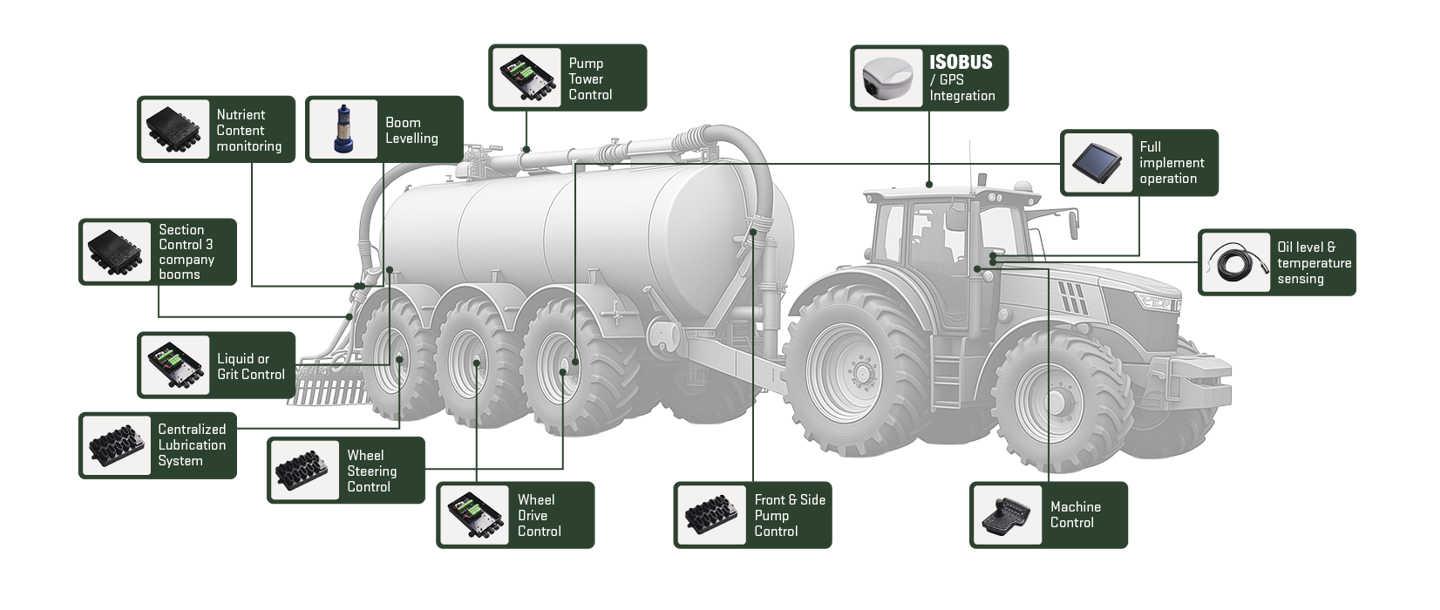 We have many existing Slurry & Muck solutions we can optimise to suit OEM requirements- Total machine control systems, liquid control, alarm & monitoring, integrated boom levelling, GPS Section control & Autosteer.