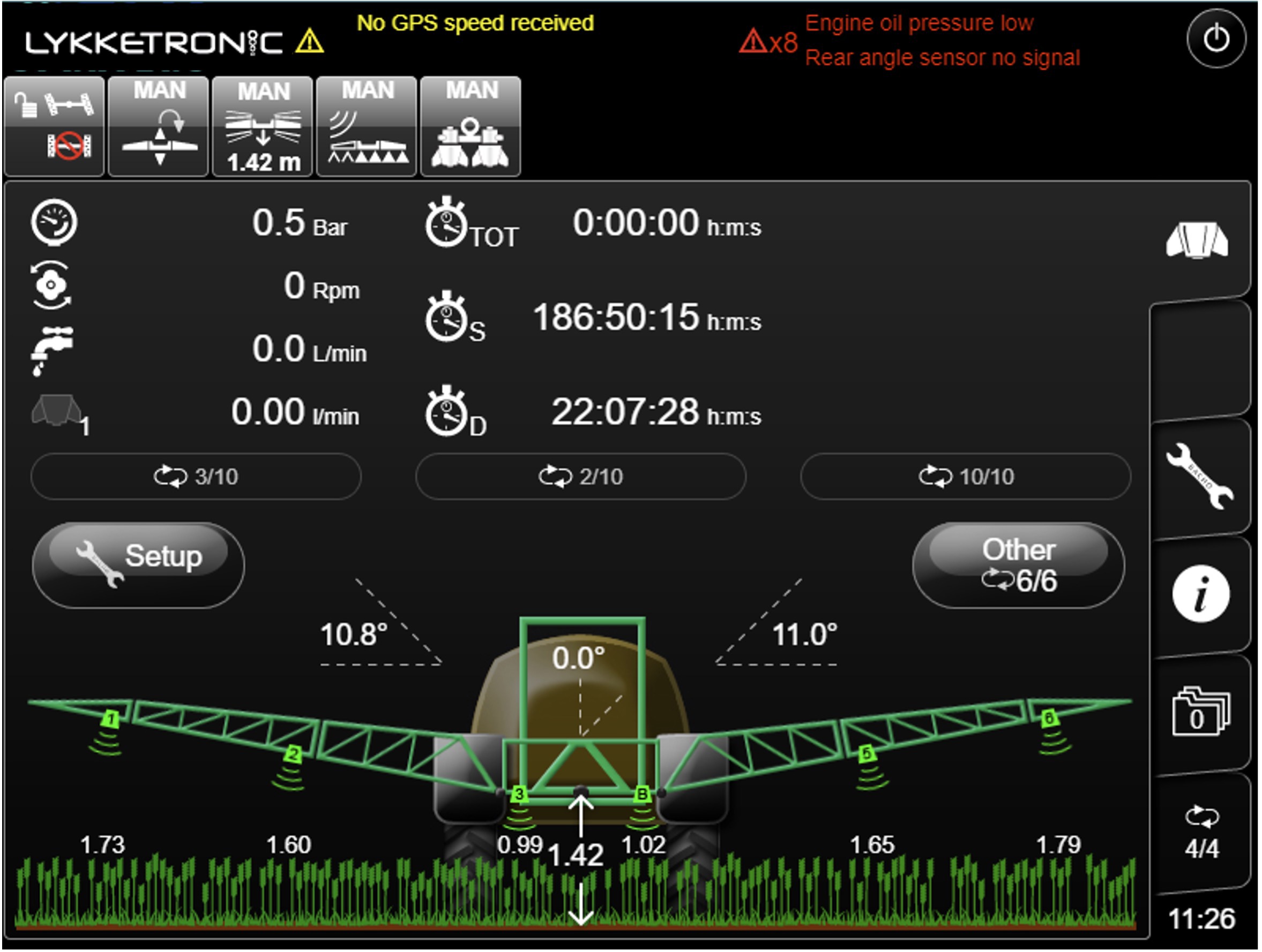 Lykketronic in house boom levelling for Slurry application is available to suit fixed boom levelling or variable geometry booms. Hardware & software developed completely in house focusing on modular architecture allowing system updates in the future. The modular system architecture allows ease of integration by the OEM to suit their requirements.