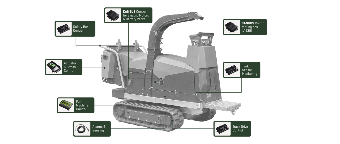 Full machine control for Wood Chippers, managing all features from machine movement, Remote control, Engine control & diagnostics, & Safety features. Available in different hardware formats depending on the use case.